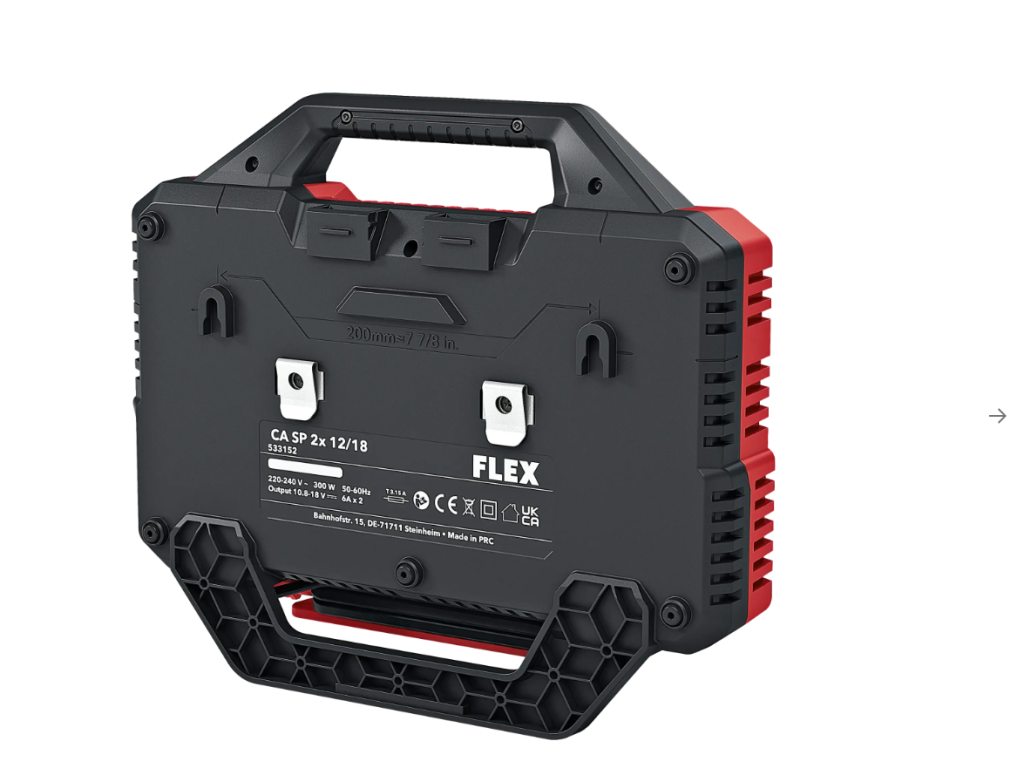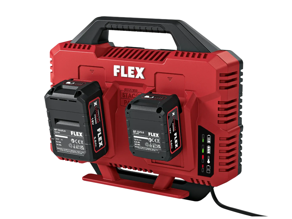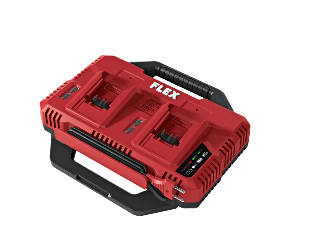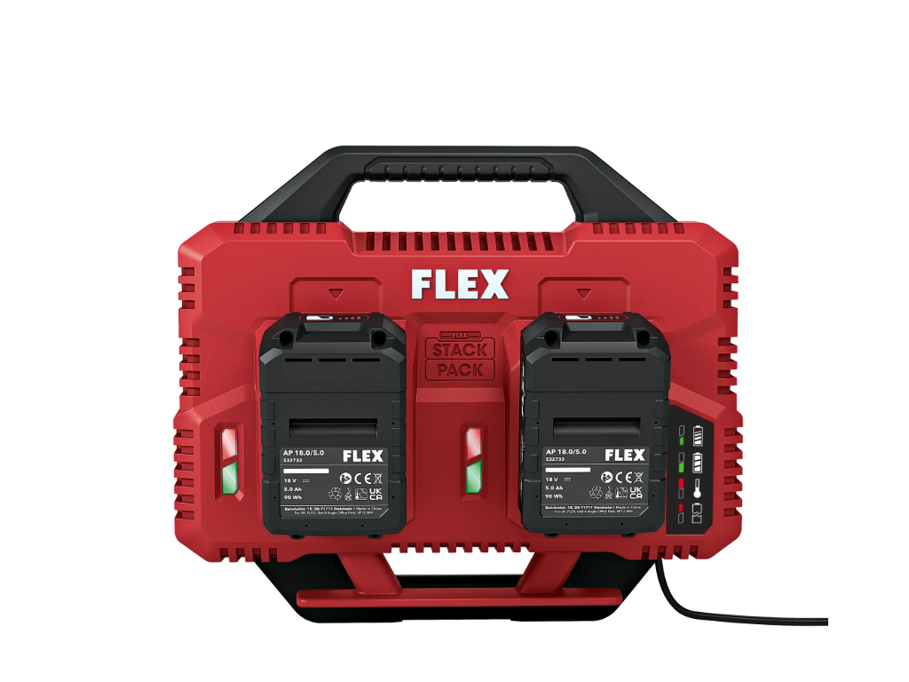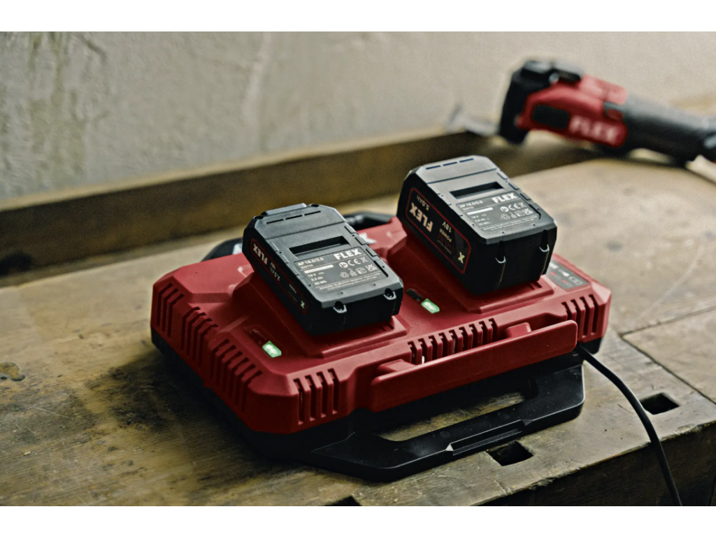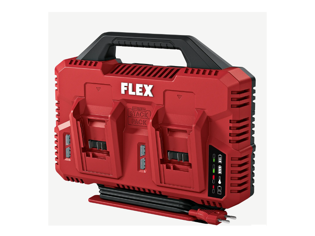 Rychlonabíječka s prostorem pro dva akumulátory. Výkon 2 x 150 W pro rychlé a současné dvou nabíjení akumulátorů 12 a 18 V. S LED ukazatelem stavu nabití, integrovaným chlazením akumulátoru a ochranou proti přehřátí, vybití a přetížení. Uložení kabelů na krytu a možnost montáže na zeď zajišťují pořádek. Rychlonabíječka je kompatibilní se skladovacím a přepravním systémem FLEX STACK PACK a lze ji namontovat na víko boxů/organizérů. Doba nabíjení pro 18V baterie: 2.5 Ah / 40 min, 5.0 Ah / 60 min, 8.0 Ah / 95 min.